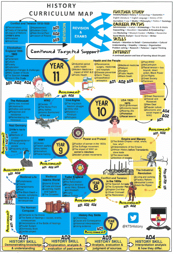 History at KTS includes a range of activities aimed at getting students to utilise their creativity to help them to learn a vast amount of contextual knowledge; students are regularly given a choice of how to complete tasks and record notes, allowing them to create their own resources, whilst students are regularly given opportunities to work collaboratively and create responses as a group. Critical thinking is integral to History and analytical and evaluative skills are central to completing tasks and assessments. In terms of resilience, students are routinely expected to complete difficult tasks and all students are encouraged to be aspirational and ambitious. As we cover such a huge range of history and students are regularly required to make links between different developments and time periods.