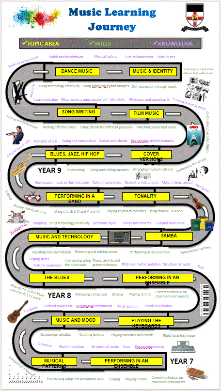 Below you will find more specific information about the curriculum in Music for Year 7 students, explaining to you what students will learn, when, why and how. There is also information about how parents/carers are able to support students in their learning, extra-curricular opportunities in this subject and how it links to other subjects and the wider world.